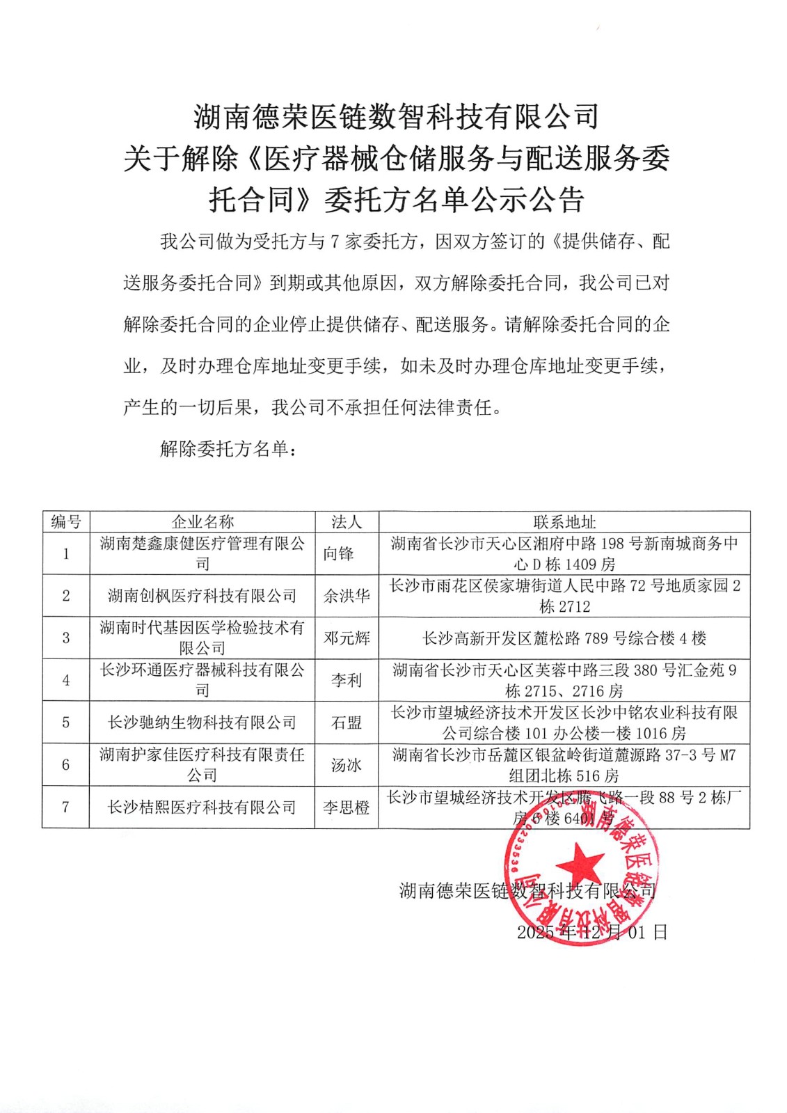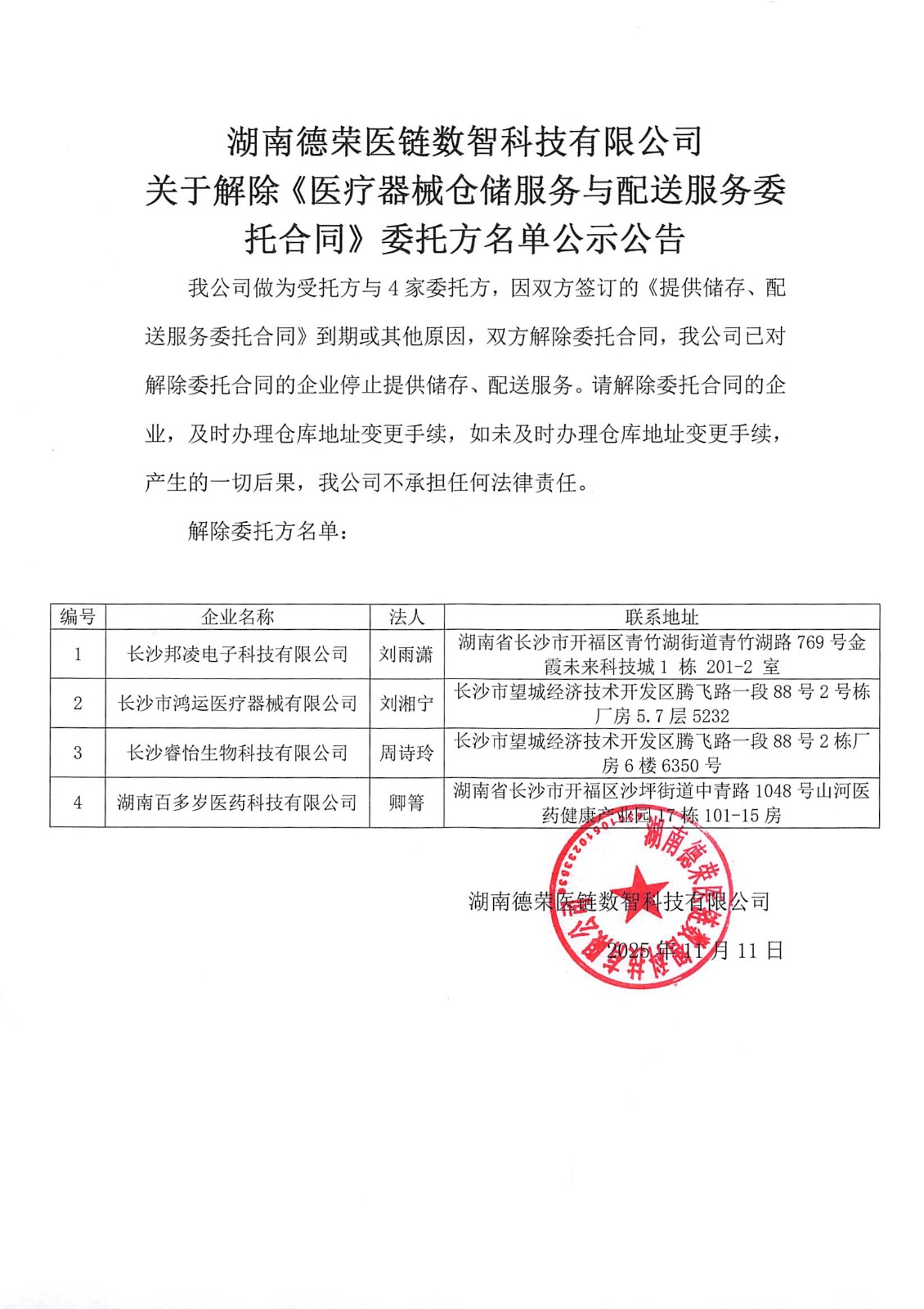 关于解除《医疗器械仓储服务与配送服务委托合同》委托方名单公示公告
