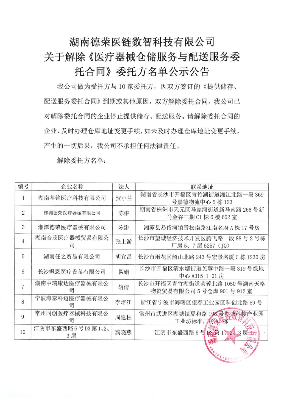 关于解除《医疗器械仓储服务与配送服务委托合同》委托方名单公示公告